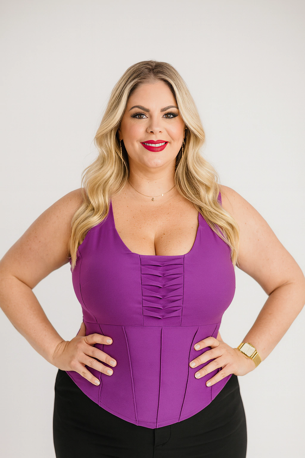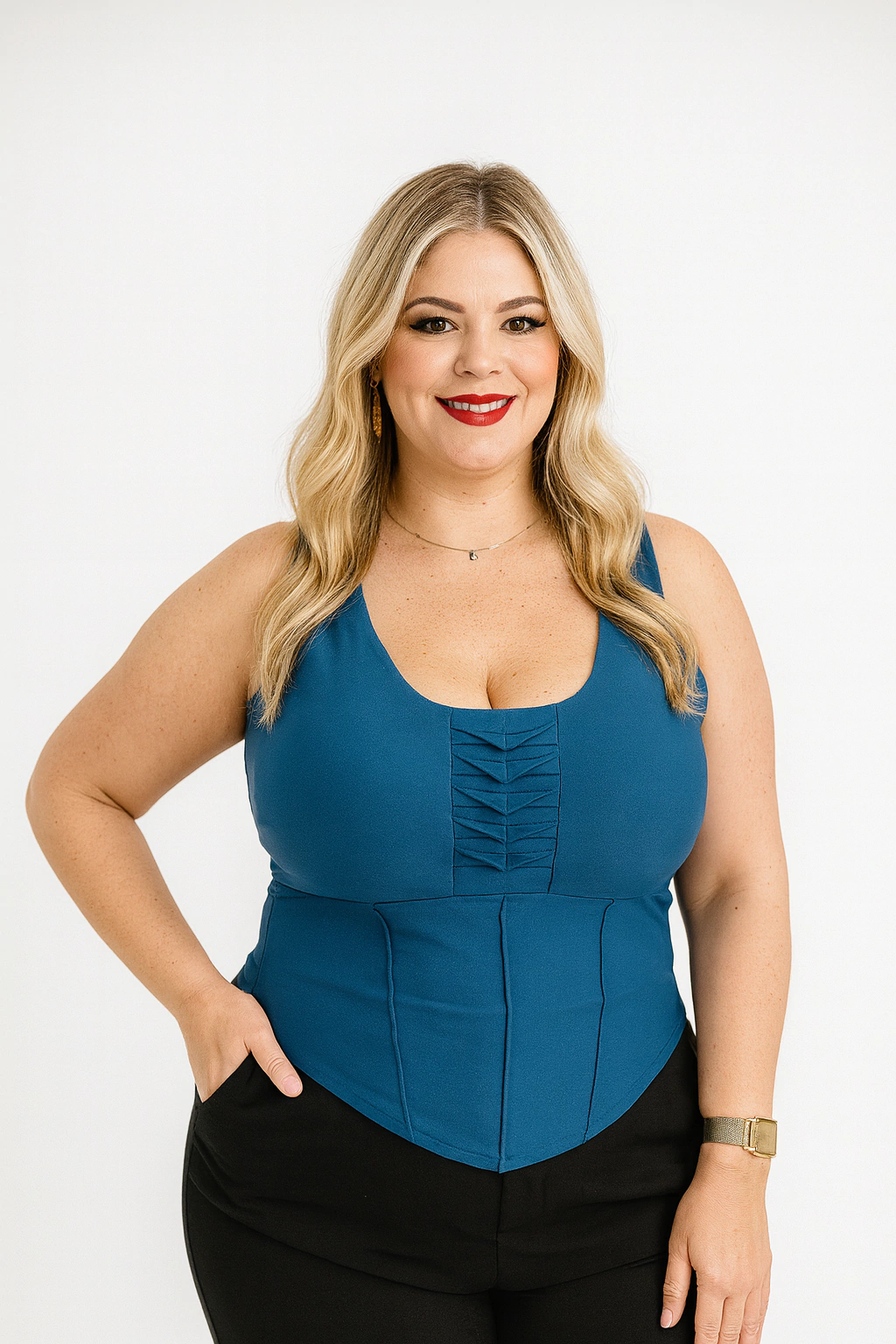 No modelo regata, o Cropped Bianca é versátil e pode ser combinado facilmente com saias, calças ou shorts, criando desde produções casuais até looks mais sofisticados. Sua modelagem foi especialmente pensada para o público plus size, vestindo do 46 ao 52 com conforto e segurança.