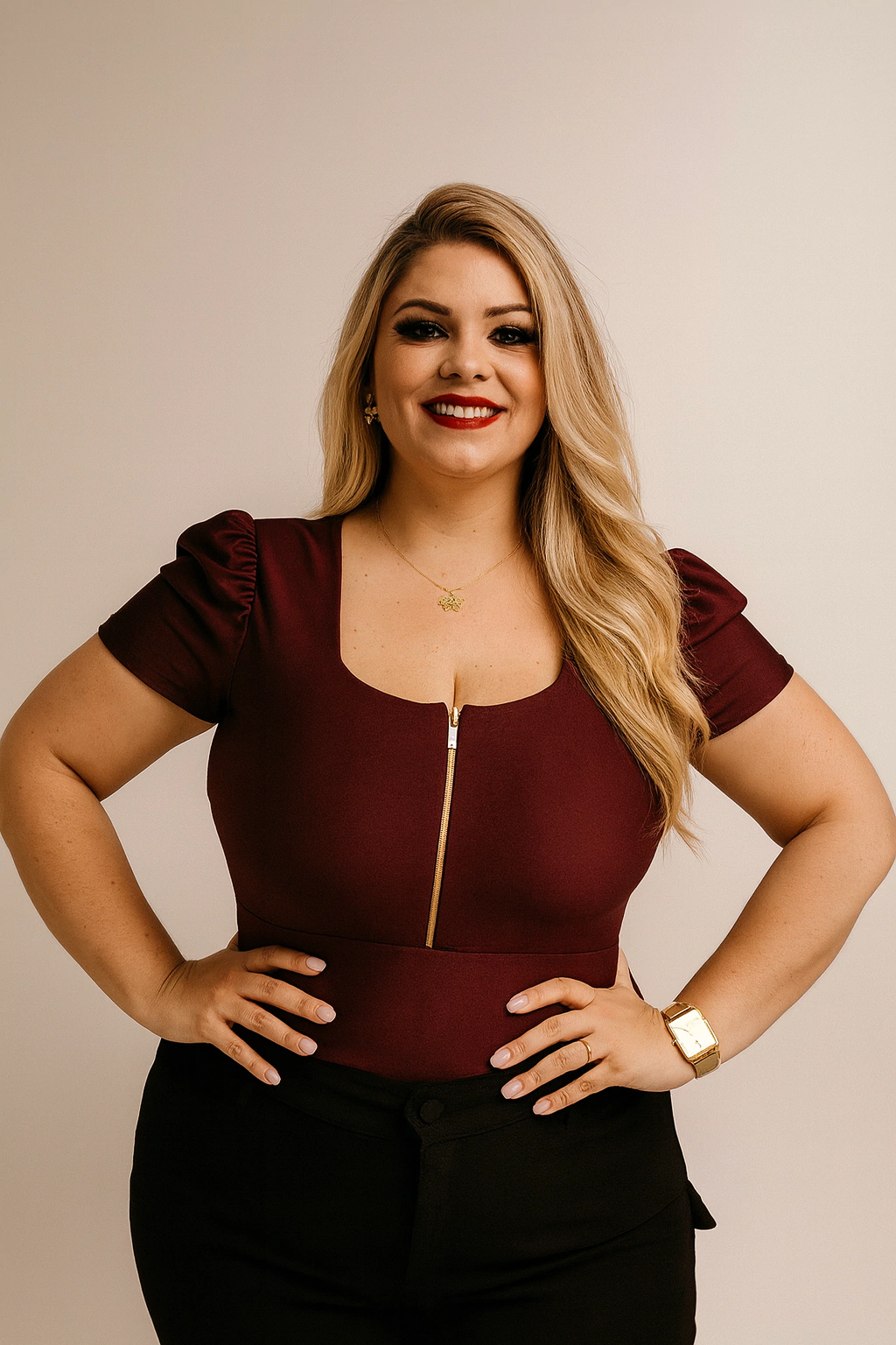 O modelo conta com bojo embutido, garantindo sustentação e modelagem impecável, além de zíper frontal funcional, que adiciona charme e facilita na hora de vestir.